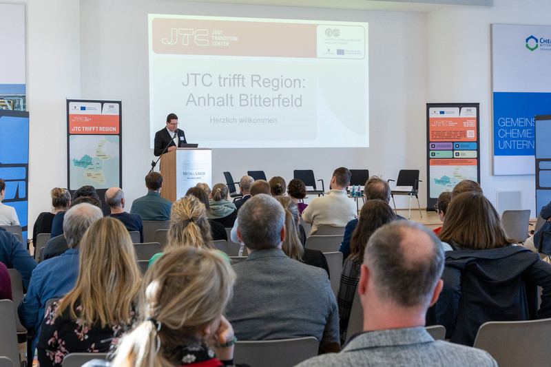 Eröffnet wurde die Veranstaltung von Armin Schenk, Oberbürgermeister der Stadt Bitterfeld-Wolfen, und Prof. Dr. Christian Tietje, Vorstand des JTC. Einen zentralen Impuls setzte Elena Herzel von der Entwicklungsgesellschaft Bitterfeld-Wolfen mbH mit ihrem Keynote-Vortrag zu aktuellen Chancen und Herausforderungen der regionalen Transformation in Anhalt-Bitterfeld und darüber hinaus.